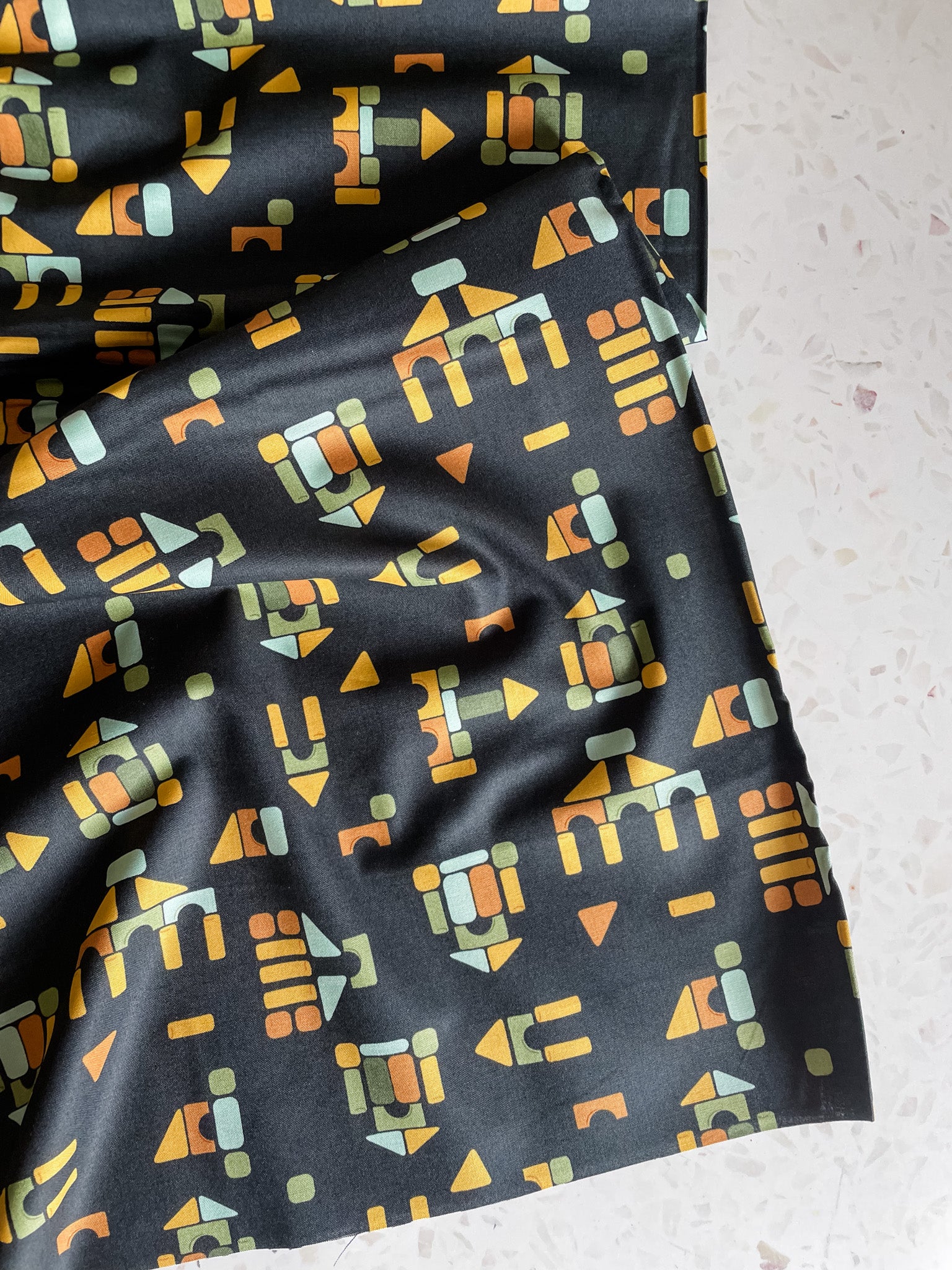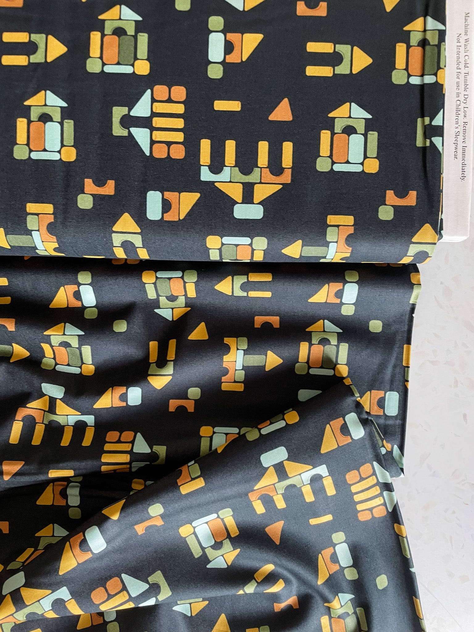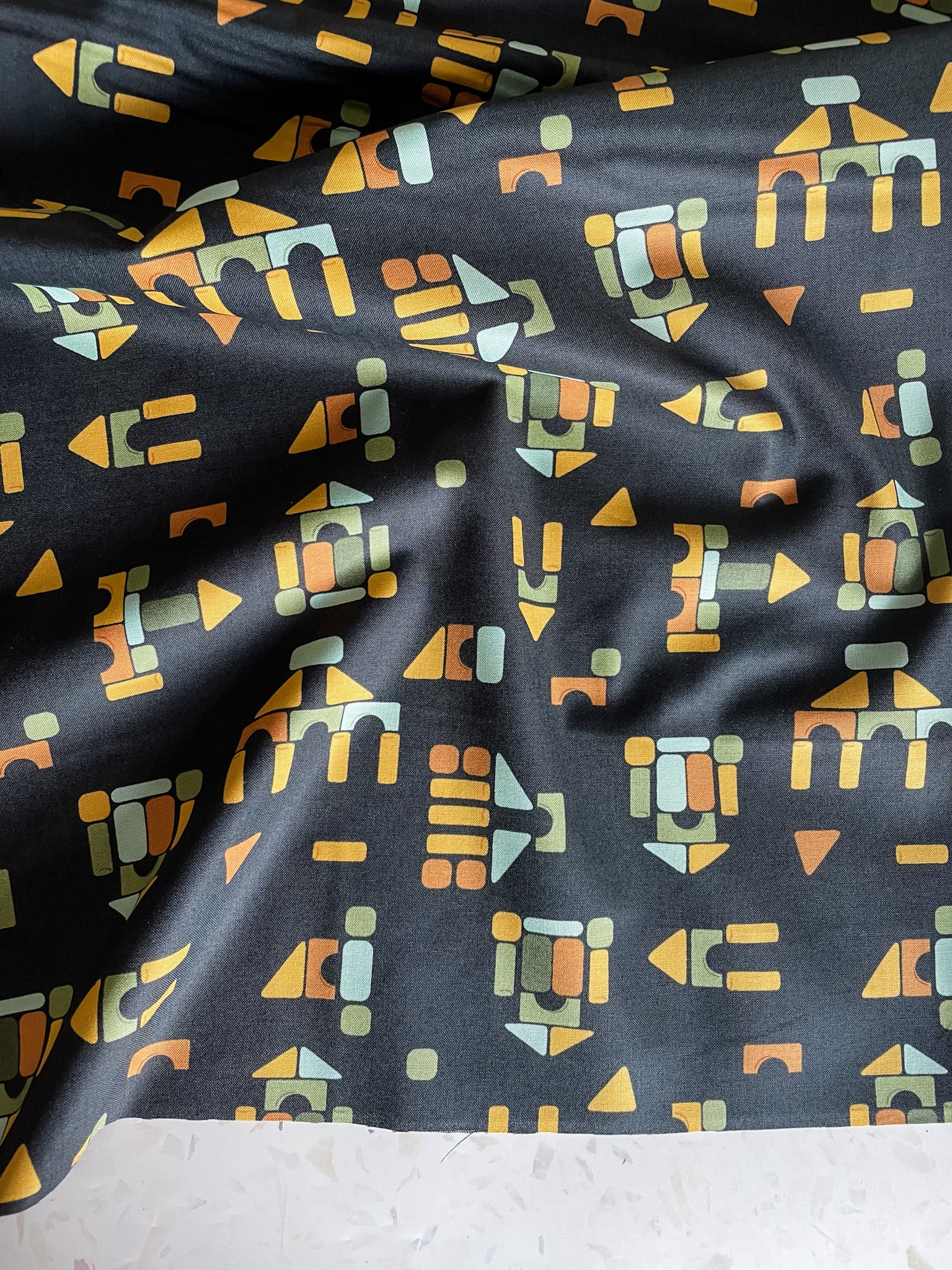 Designed by Stacy Iest Hsu for Moda, ABC XYZ is a playful collection inspired by early learning. This black print features colorful wooden blocks arranged into whimsical shapes—triangles, arches, and rectangles that spark imagination and remind us of childhood play.