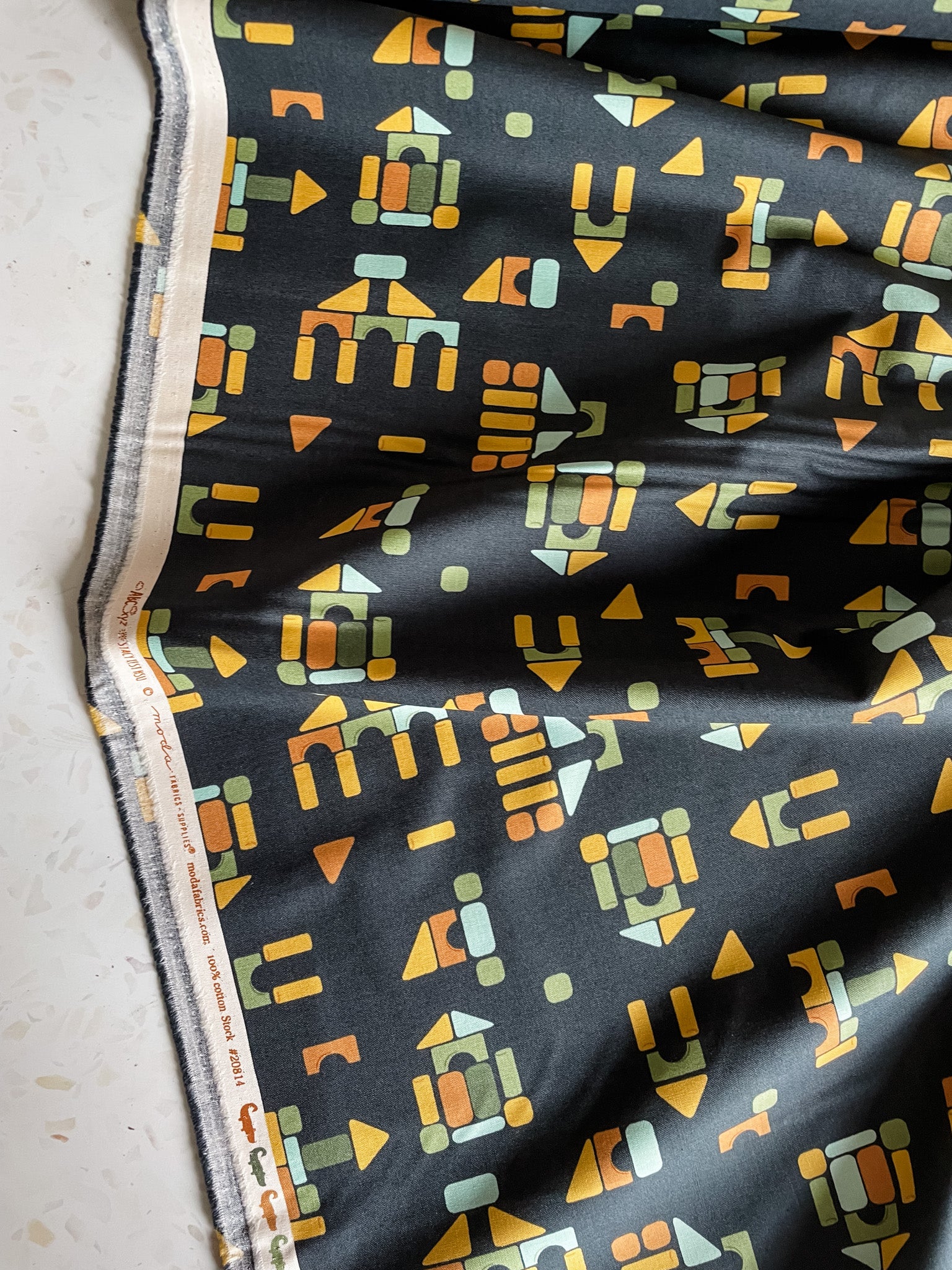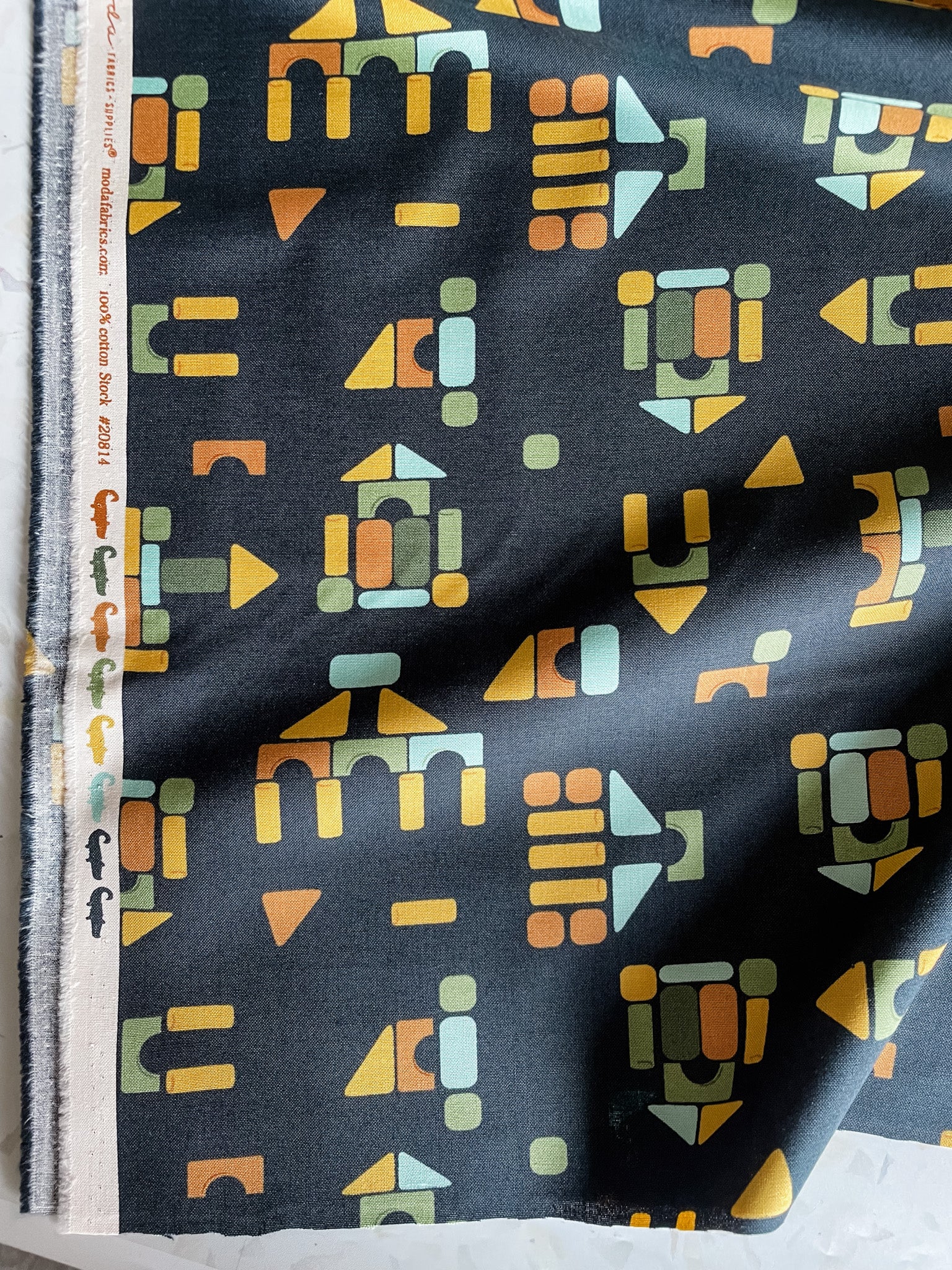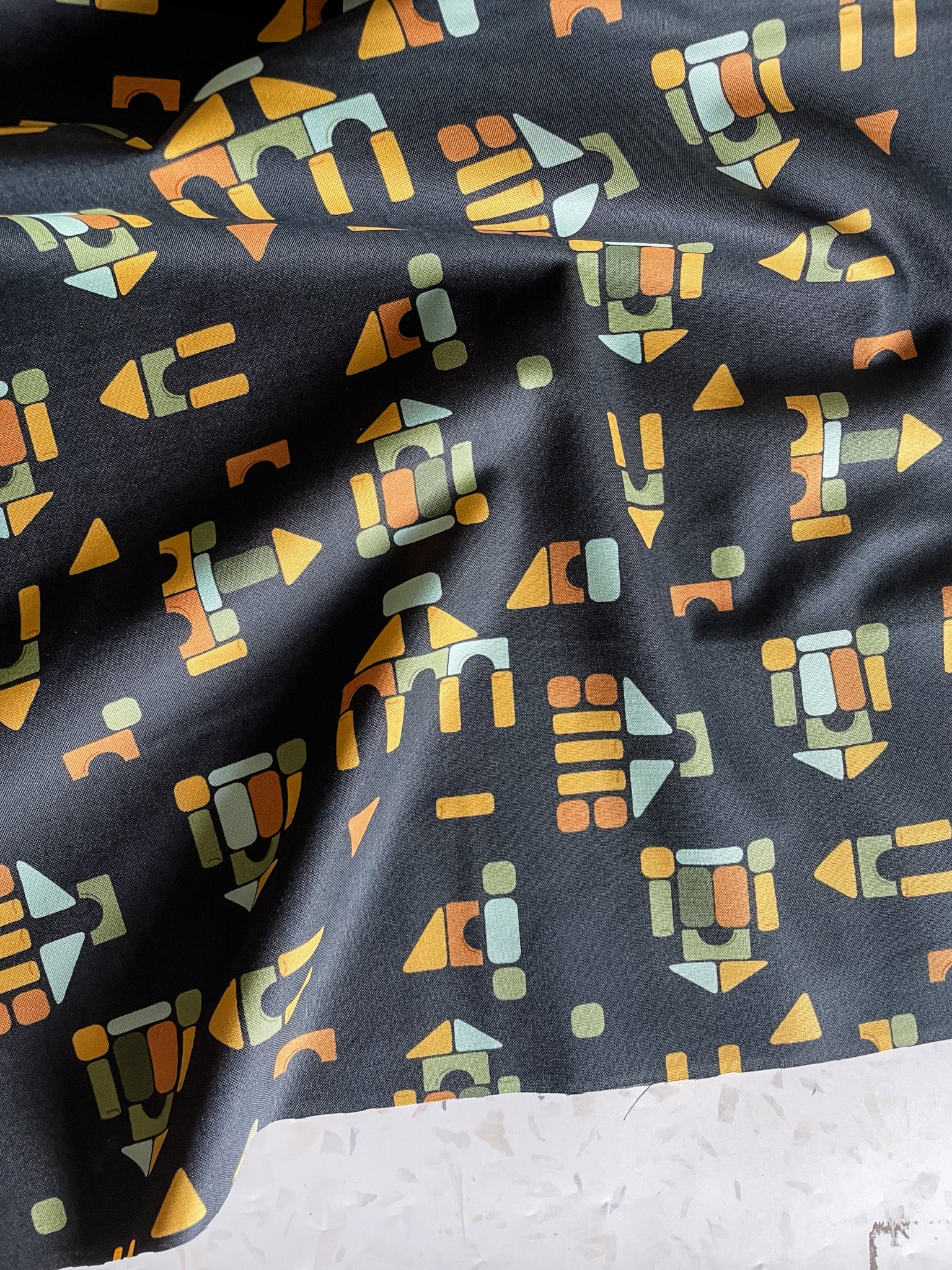 Designed by Stacy Iest Hsu for Moda, ABC XYZ is a playful collection inspired by early learning. This black print features colorful wooden blocks arranged into whimsical shapes—triangles, arches, and rectangles that spark imagination and remind us of childhood play.
