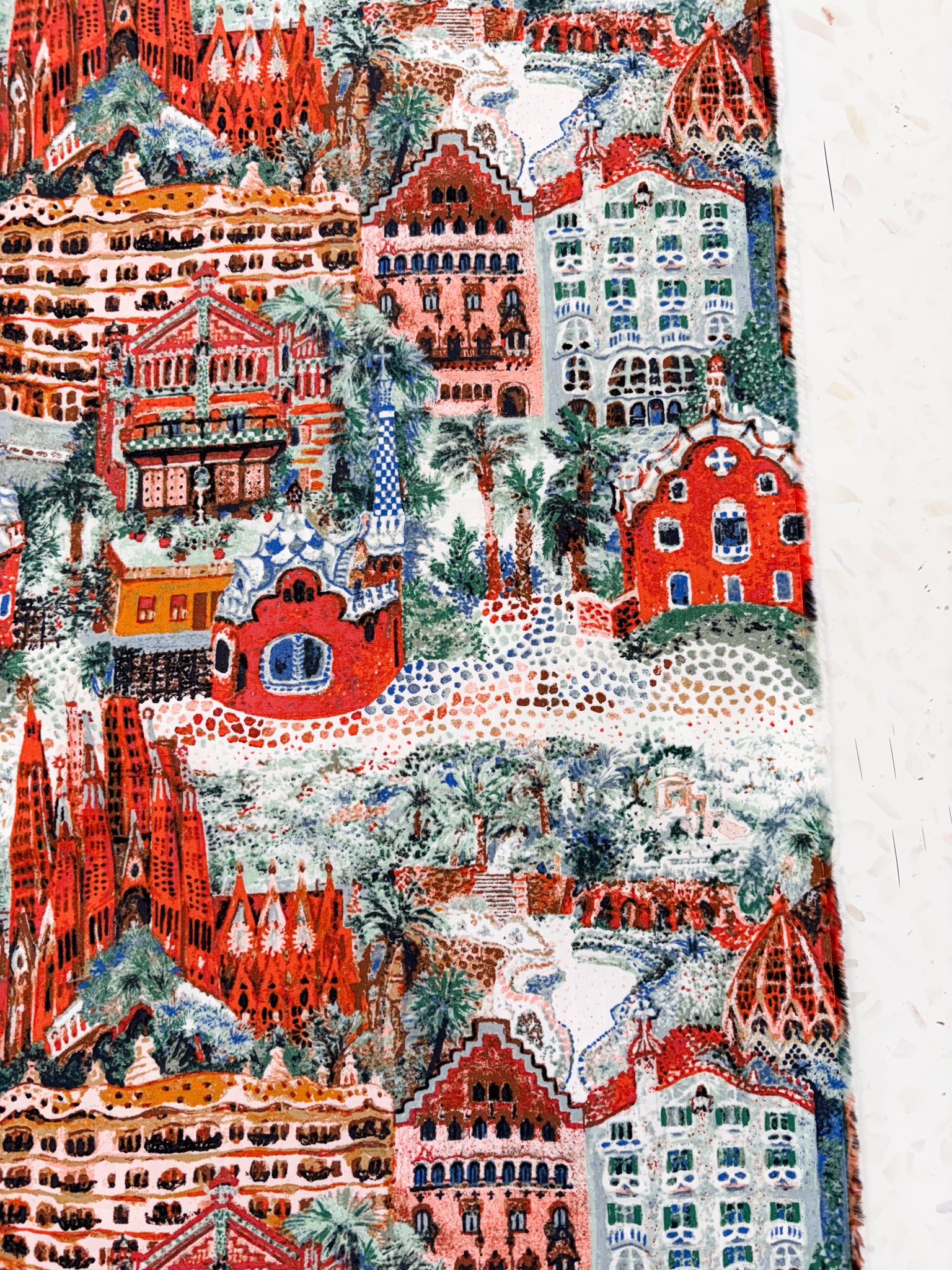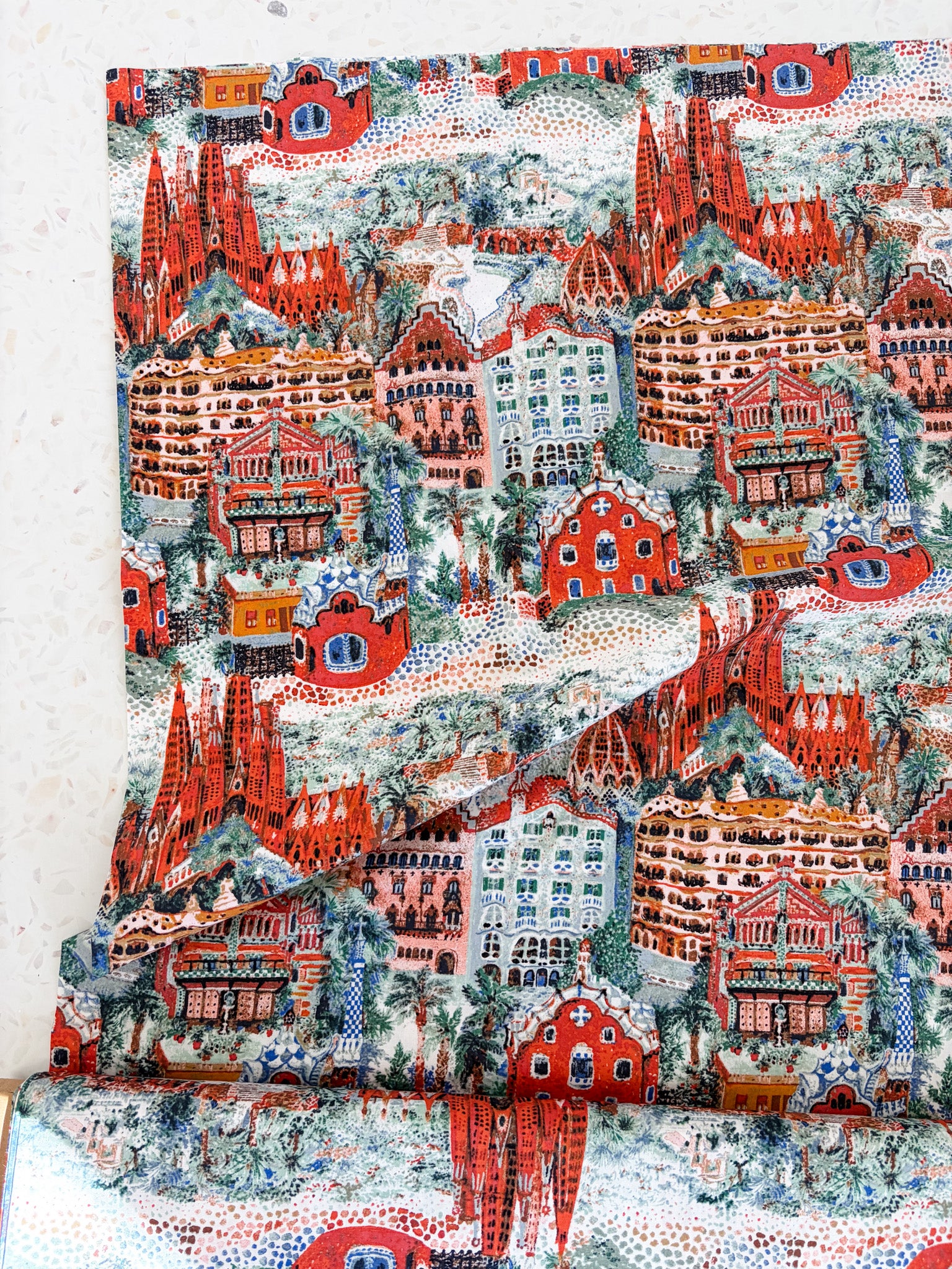 Featuring iconic landmarks, this fabric is a tribute to the artistry of a city that lives and breathes creativity. Bold jewel tones of emerald green, cobalt blue, and terracotta saturate this print bringing the vibrant essence of Barcelona to your sewing and quilting projects.