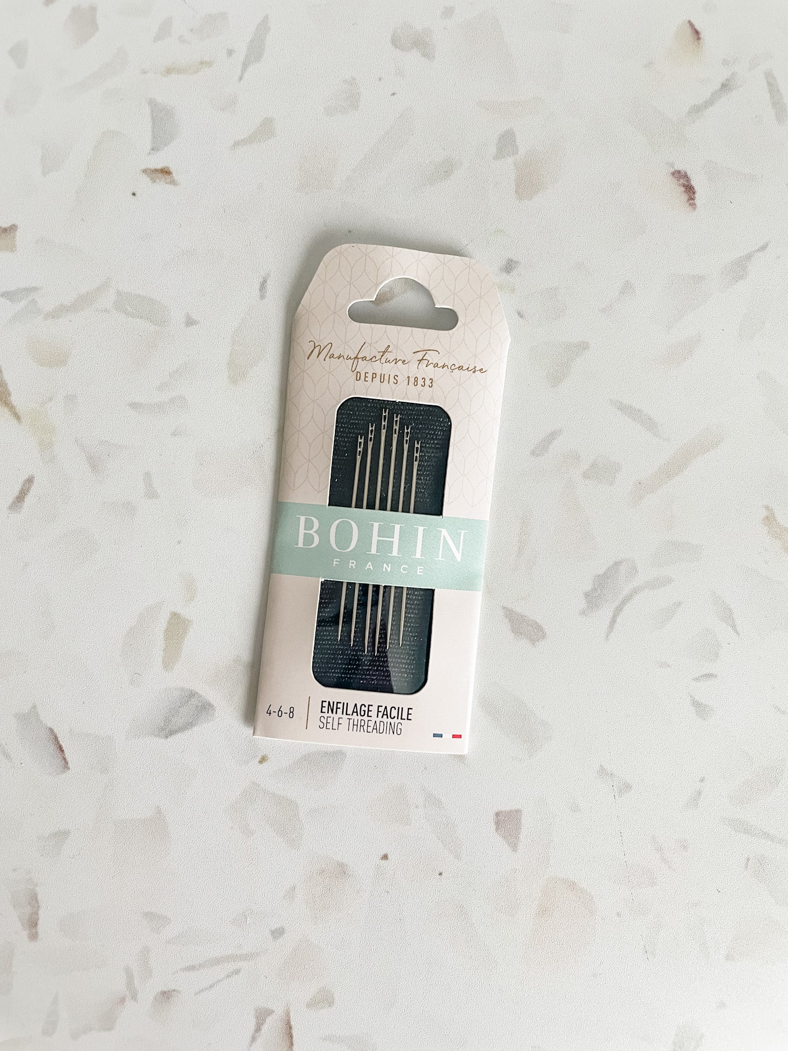 Bohin Self Threading Needles are made with a small spring that helps thread the eye of the needle. This assorted pack of universal needles includes size three and size eight needles; six needles in total.Size: 3 and 8