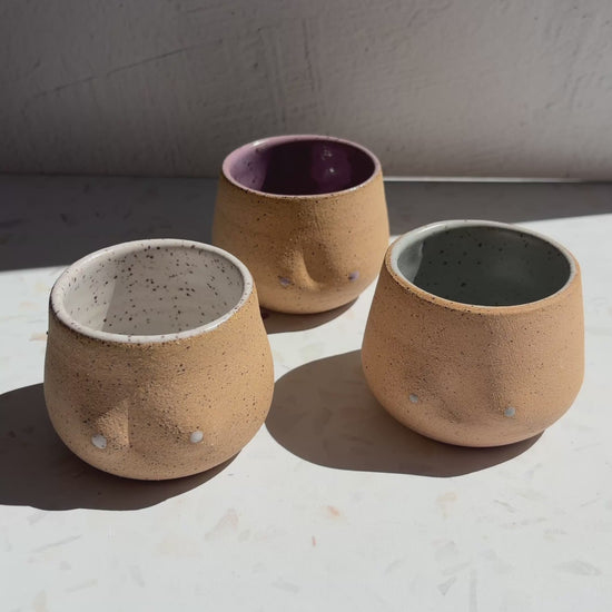 Each one was thrown on the potter's wheel using beige stoneware and glazed inside with a smooth interior in white, mint, or lavendar. Holding just under two ounces, these multi-purpose cups also do well as match holders or even drinkware (food and dishwasher safe).