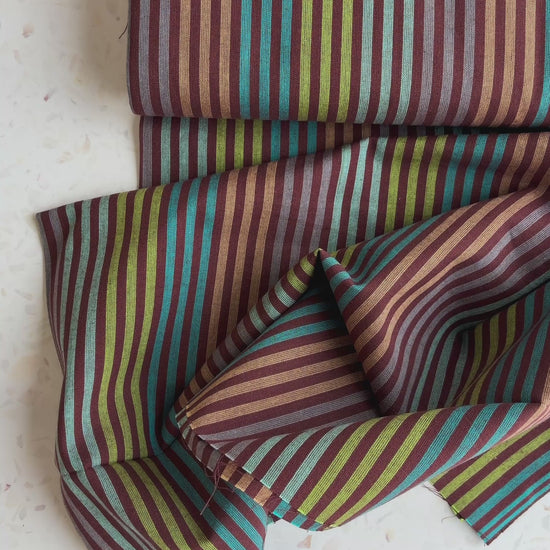 Cabana Stripe in Lemongrass is a cheerful yarn-dyed cotton woven featuring narrow stripes in a vibrant mix of greens, teal, warm browns, and soft neutrals. The lively palette gives this fabric a fresh, playful feel while still maintaining a timeless stripe that’s easy to incorporate into a variety of sewing projects.