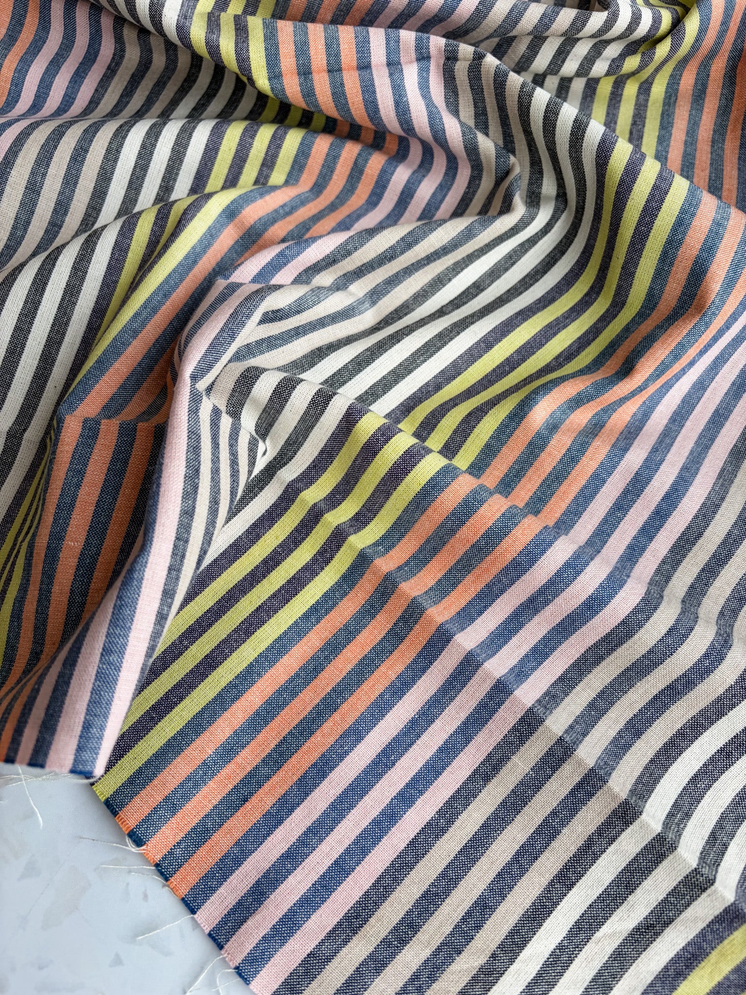 Perfect for shirts, dresses, skirts, and lightweight pants, this fabric also shines in home sewing—think pillow covers, table linens, or bold quilt blocks where the stripes can be turned and pieced for visual interest.