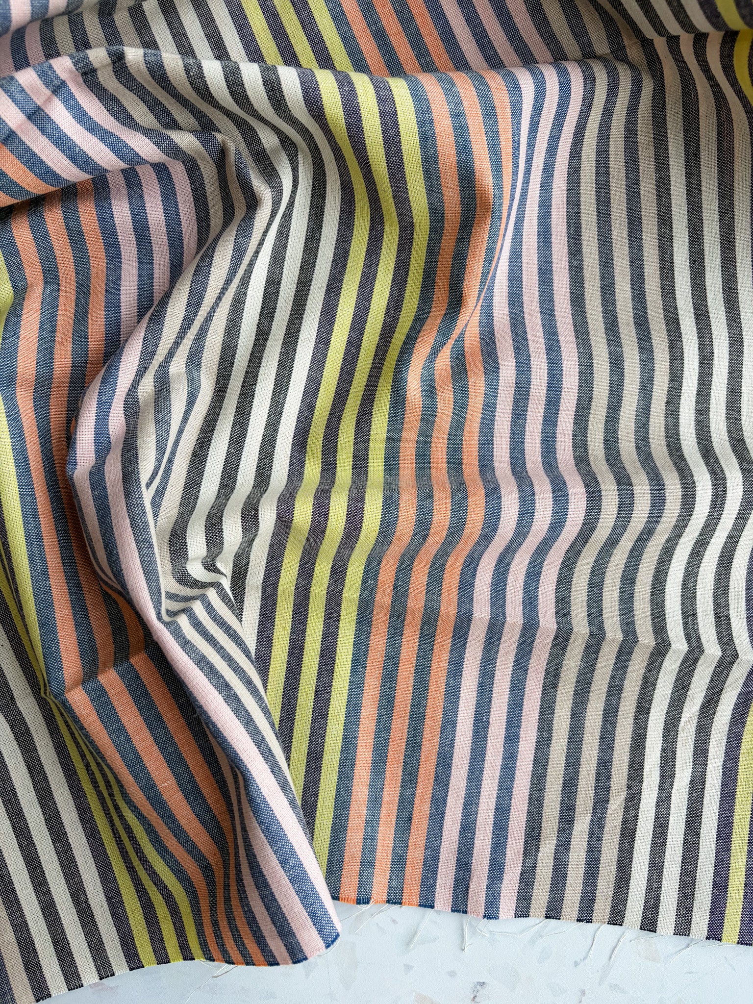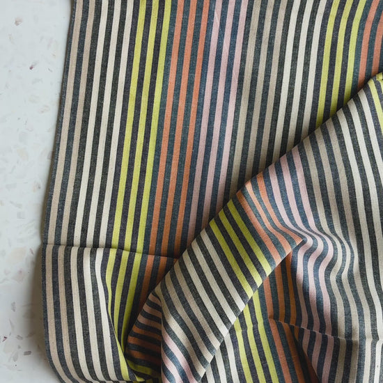 Cabana Stripe in Spritz is a playful yarn-dyed cotton woven featuring narrow stripes in a soft mix of warm neutrals, charcoal, peach, and fresh citrus tones. The balanced palette gives this stripe a relaxed, modern feel while still keeping the timeless look of a classic woven stripe.