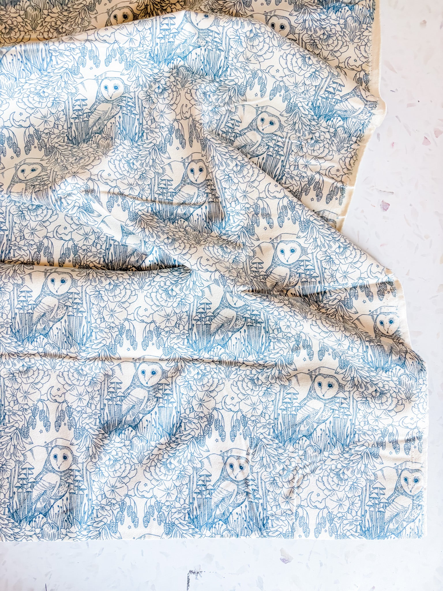 Step into a forest at twilight with Moonlit Guardian Sky — an ethereal print from Katie O’Shea’s Coyote Hill collection. Illustrated owls perch among wild mushrooms and moonlit flora, rendered in inky blue lines that evoke the stillness of the night.