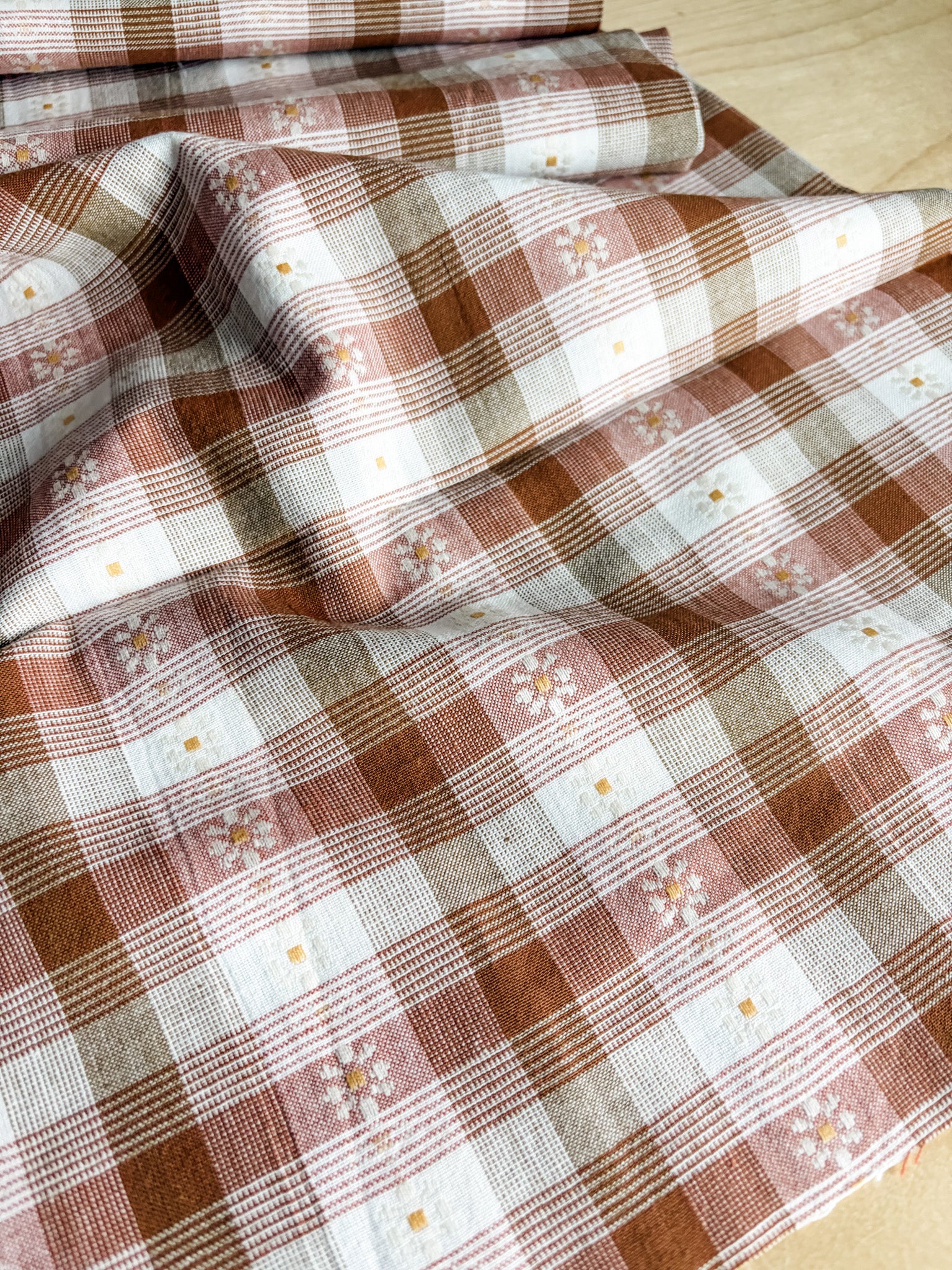 Soft, sun-washed, and irresistibly nostalgic, Daisy Plaid in Rose Gold brings a gentle vintage charm to any project. This yarn-dyed woven features a warm rose-gold check layered with tiny woven daisies—an heirloom-inspired detail that feels both playful and refined. The effect is cozy and cottagey, like a favorite quilt or the soft glow of late-afternoon light.