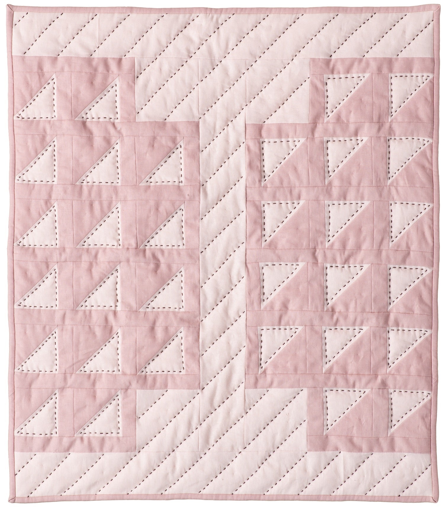 The First Blush Quilt is from the book Inheritance: Minimal Quilts for the Modern Home (2018) by Riane Elise, and this pattern is available as a standalone pattern. This pattern is double sided and features half-square triangles and strips.