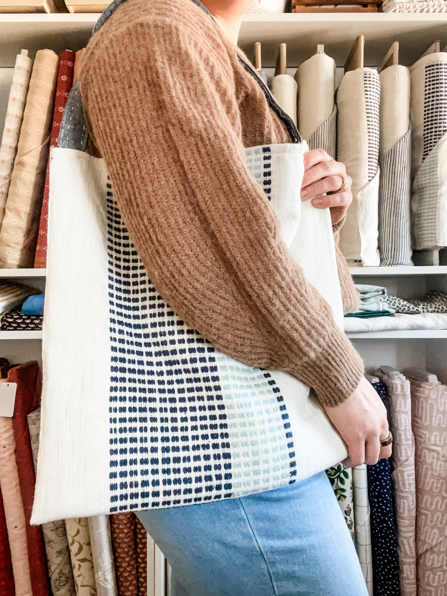 This timeless tote bag is easy to make and features an outer shell of gorgeous handloom fabric. Purchase the kit by selecting your favorite variety of handloom fabric, then follow our simple free tutorial to make the tote.
