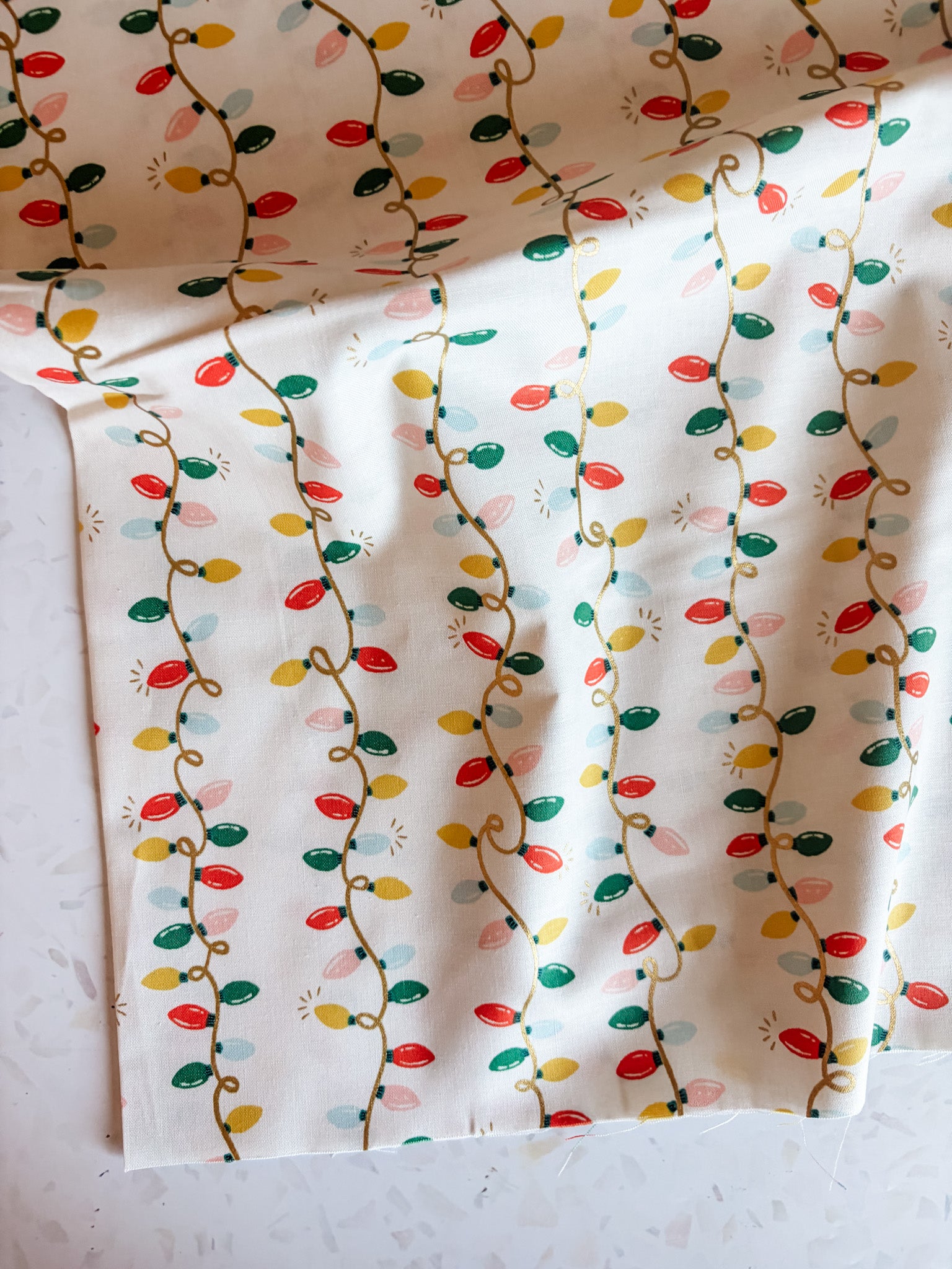Twinkling with nostalgic charm, Holiday Lights captures the magic of stringing up the tree and watching everything glow. Cheerful strands of red, green, gold, and pastel bulbs dance across a soft cream background — the perfect blend of retro whimsy and modern cheer.