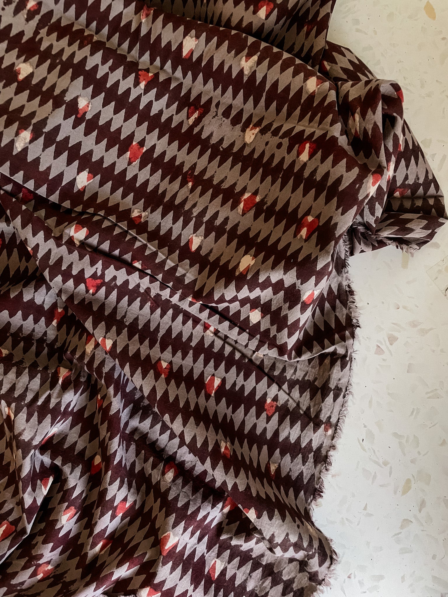 A bold diamond Indian block print in dark burgandy red and greyish purple on organic cotton. This is a soft, mid-weight cotton which would make a beautiful shirt. Perfect for tops, dresses, pajamas and lightweight breezy curtains.