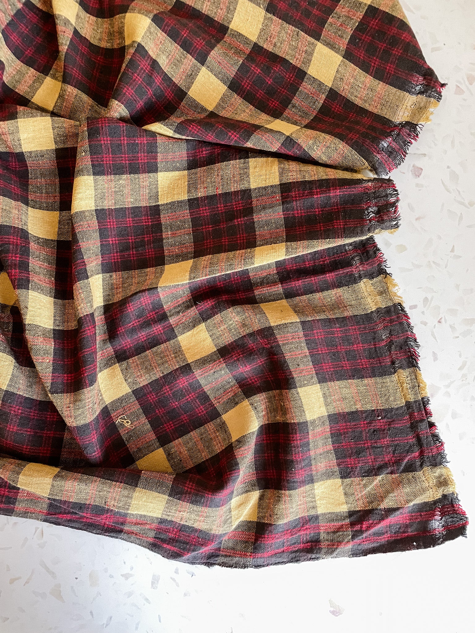This is a warm-toned check in charcoal grey, pale mustard and red, handwoven with Kala cotton. Kala cotton is a purely rain-fed cotton indigenous to the Kachchh region of India. It is grown in a sustainable way due to the resilient nature of the plant, and the use of pesticides or synthetic fertilizers are not needed. It forms a strong and coarse fiber that produces a uniquely textured cloth that makes beautiful skirts, dresses, tops and shirts. It would also be suitable for lightweight curtains, quilts and other home goods.