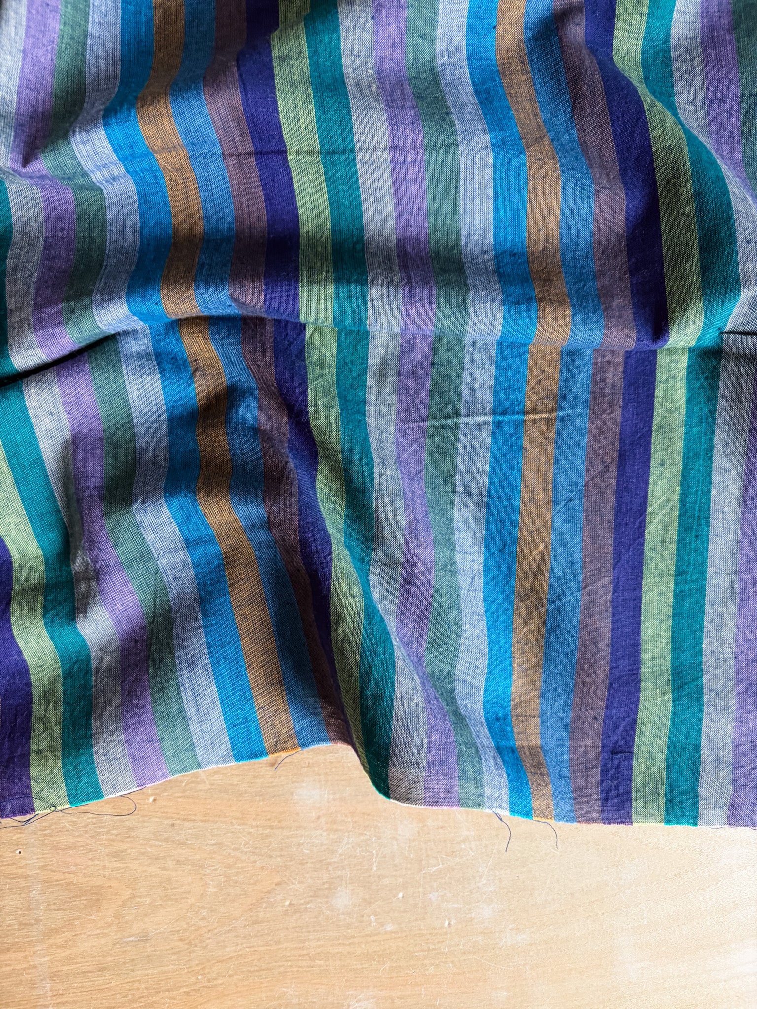 A signature Kaffe stripe with a moodier palette—this yarn-dyed woven brings together deep greens, cool teals, soft purples, and earthy neutrals in a rhythm of perfectly balanced lines. The color shifts are subtle but stunning, giving the fabric a dimensional, almost hand-loomed feel.