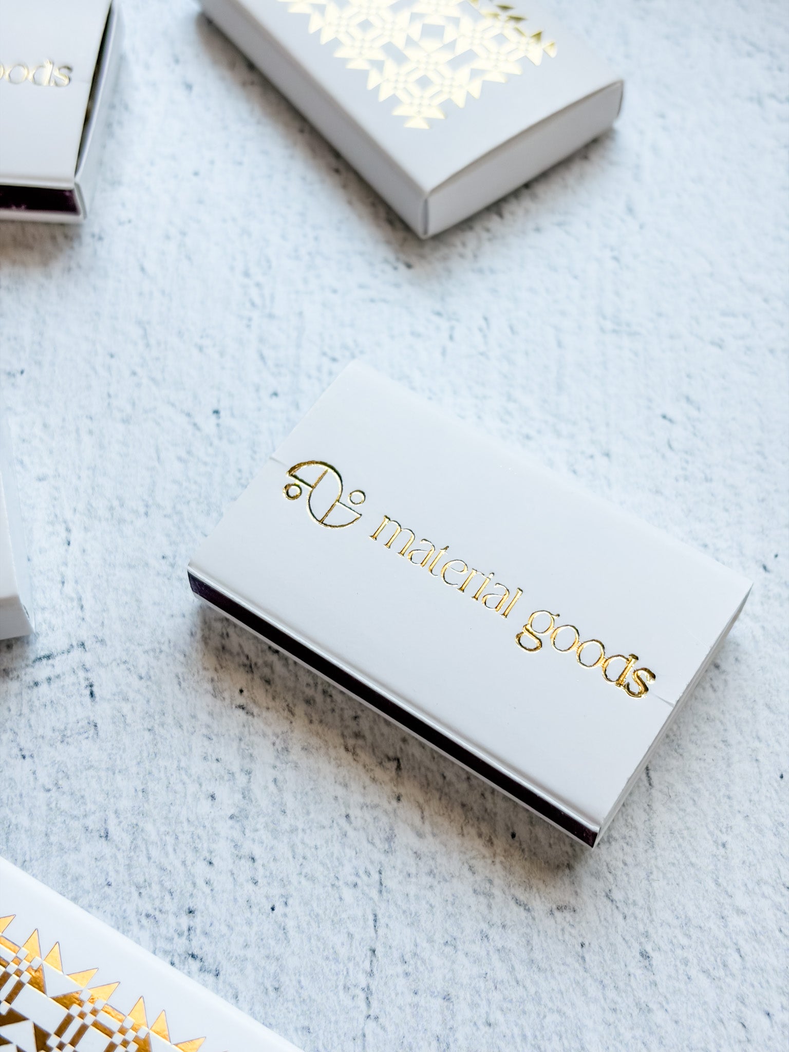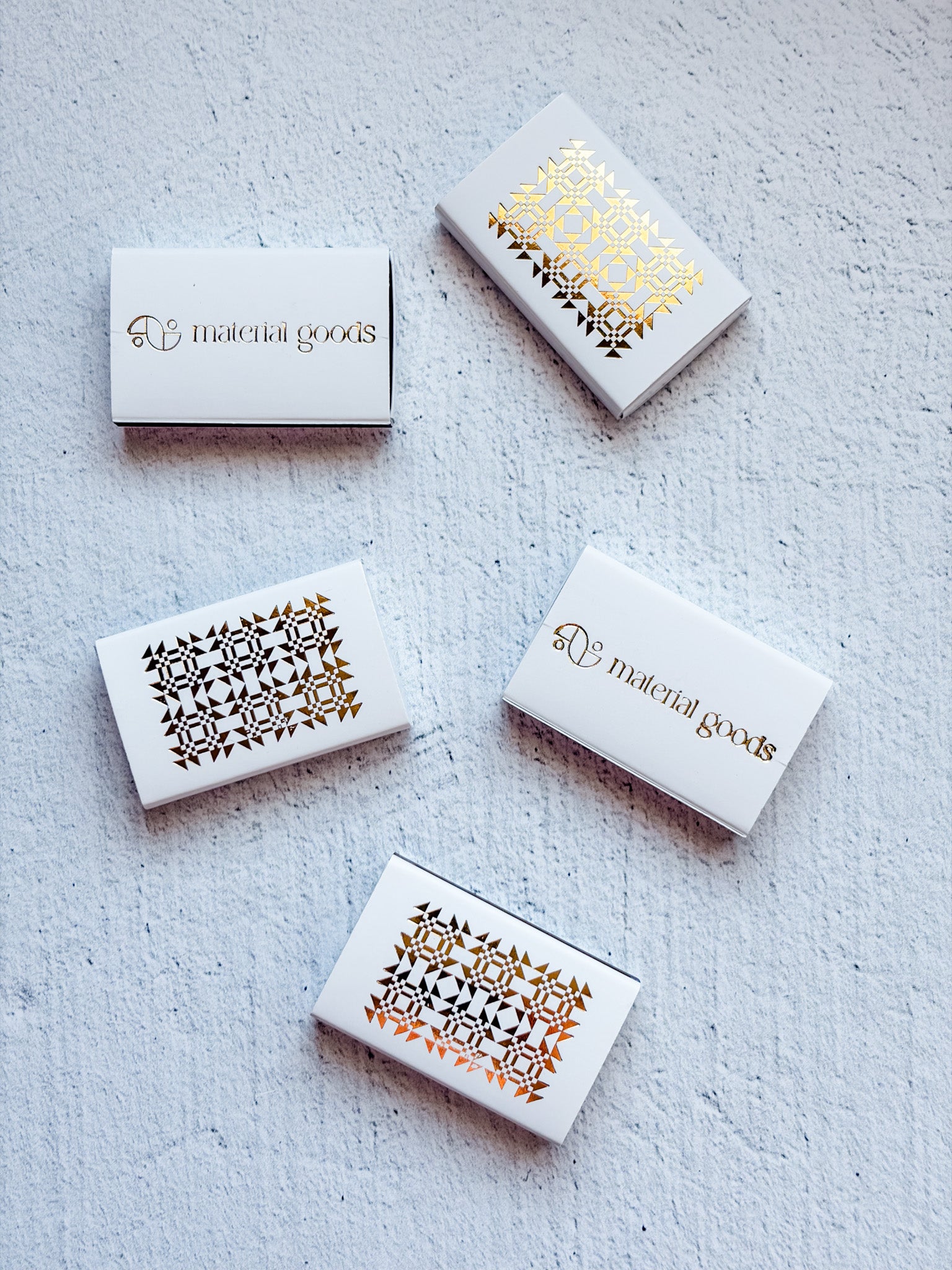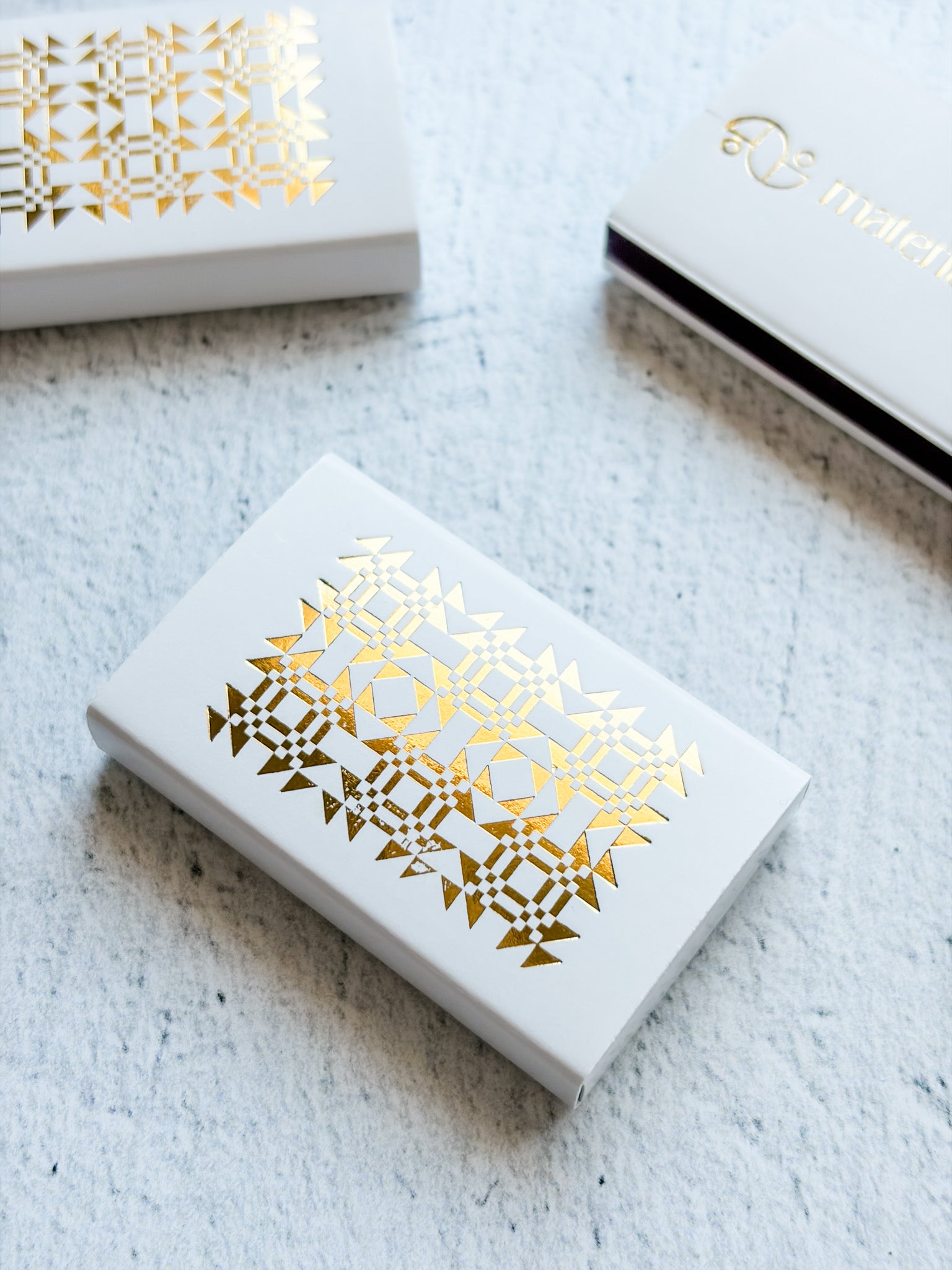These matchboxes feature a classic “Goose in the Pond” quilt block pattern in gold foil on a sleek white box.