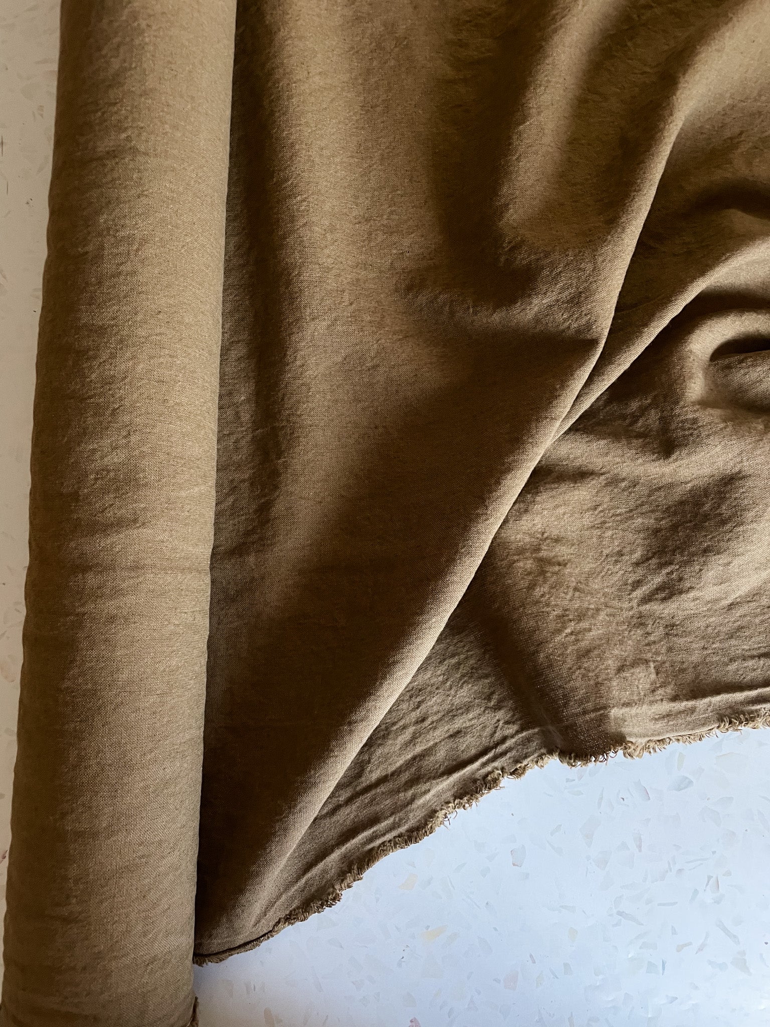 This European laundered linen and organic cotton blend is tumbled at the mill for softness and is a drab tan shade. This is a great option for dresses, tops and loose fitting pants as well as lighter curtains and everyday quilts, for a casual, less-refined look. It is produced in small batches in Eastern Europe where there is a strong heritage of spinning and weaving linen fabric. This linen is woven in a mill run on green energy and is Oeko-Tex certified.
