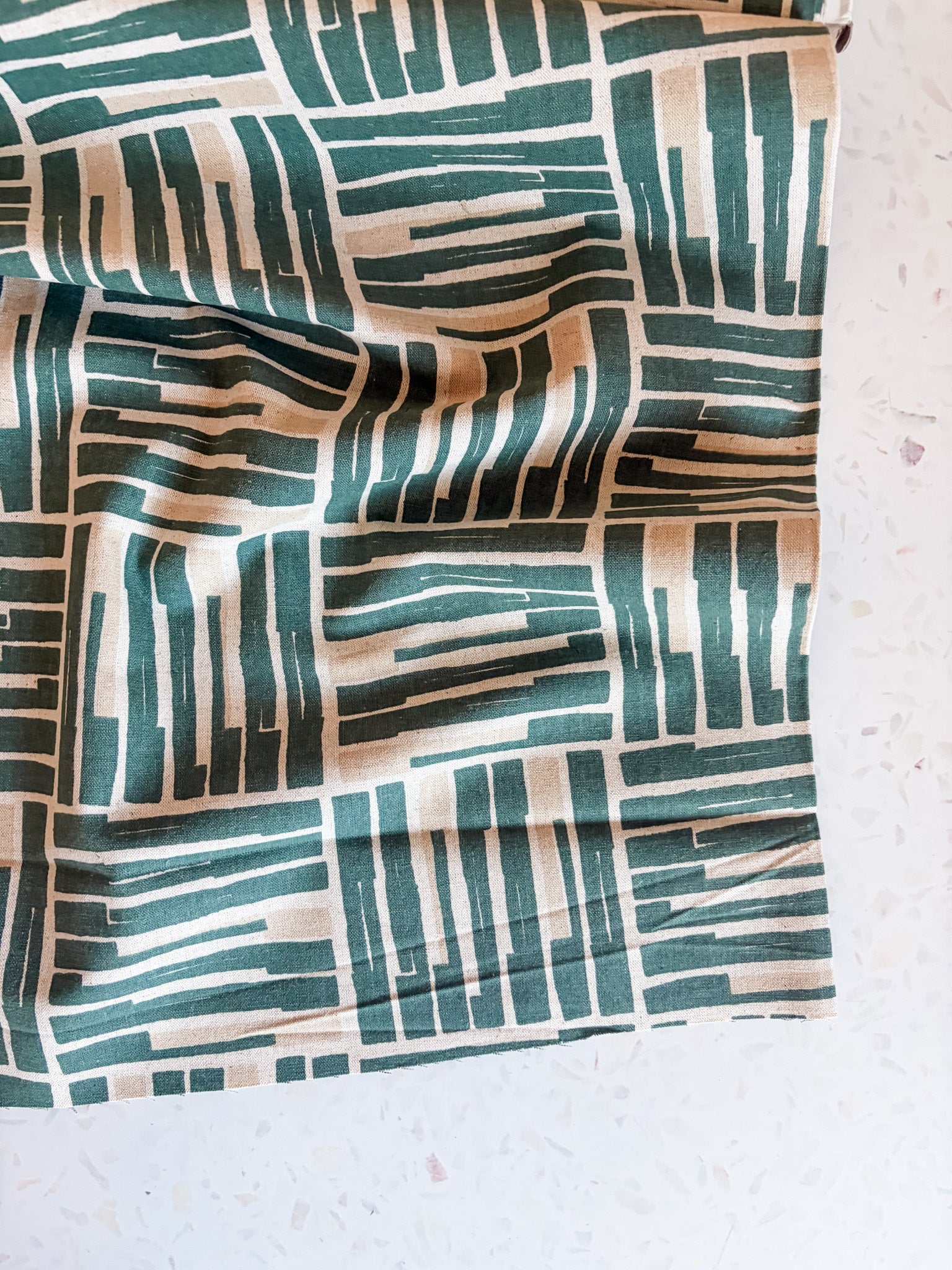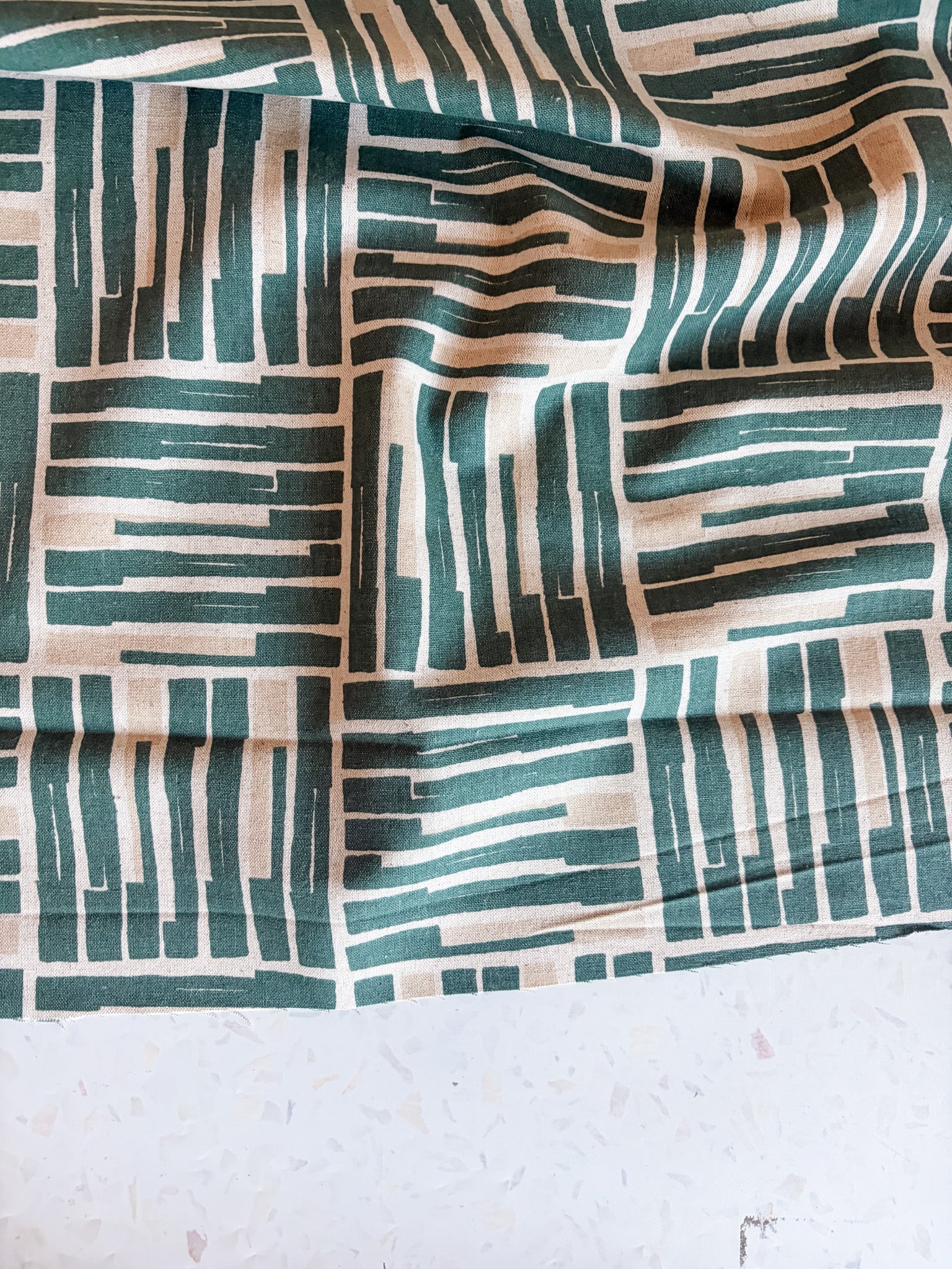 Bold, organic, and beautifully textured, Orchard Run in Ocean features hand-drawn linear blocks printed in a deep blue-green over a natural cotton–flax base. The result is a modern, artful pattern with the warmth and character of natural fibers — perfect for projects that call for both style and substance.