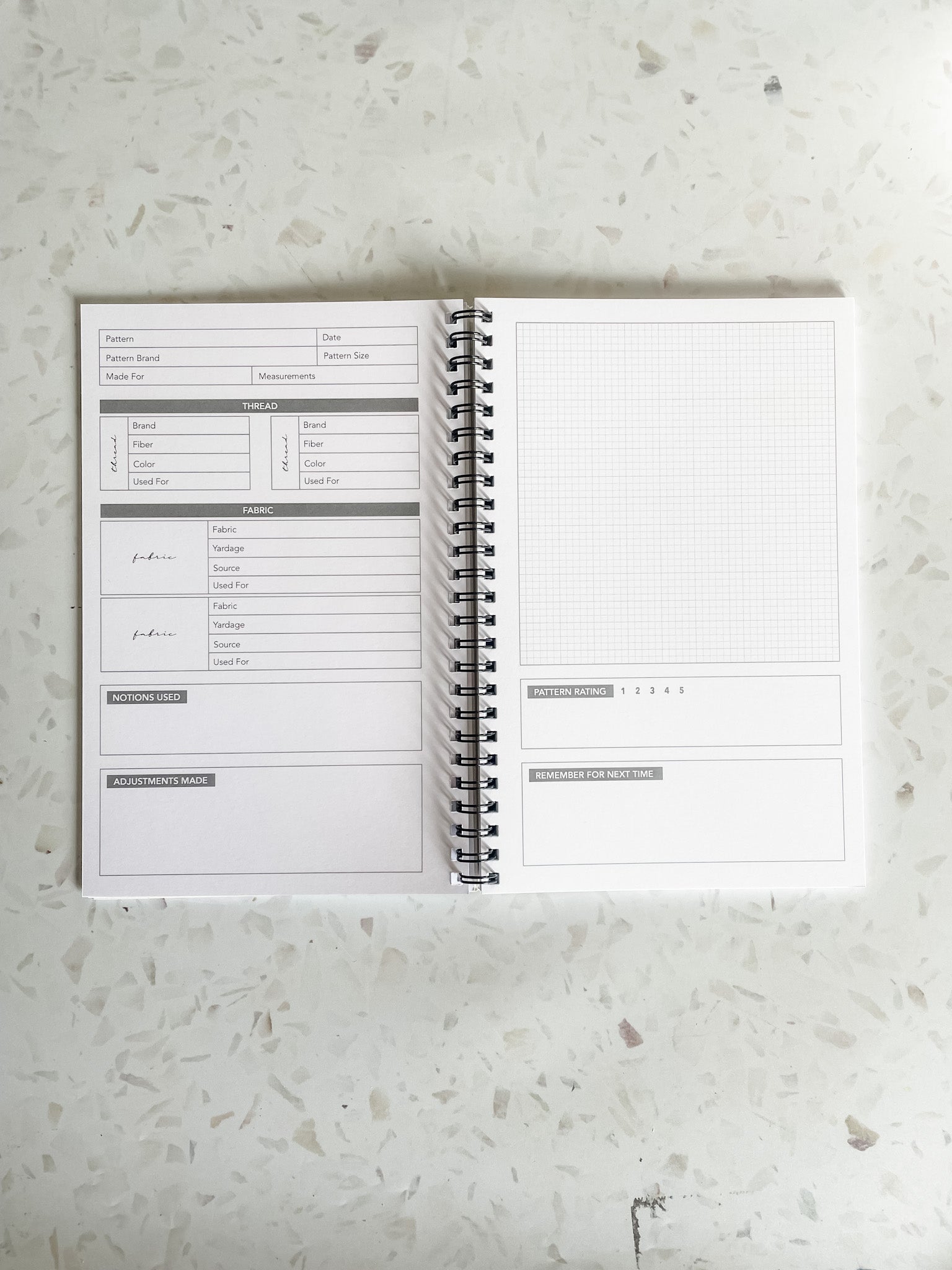 There is space to track fabric, thread, and notions used. Includes a grid to sketch the make or tape in a photo, as well as room to document adjustments made, rate the pattern, and leave reminders for yourself for next time. The interior pages are made from a cover weigh