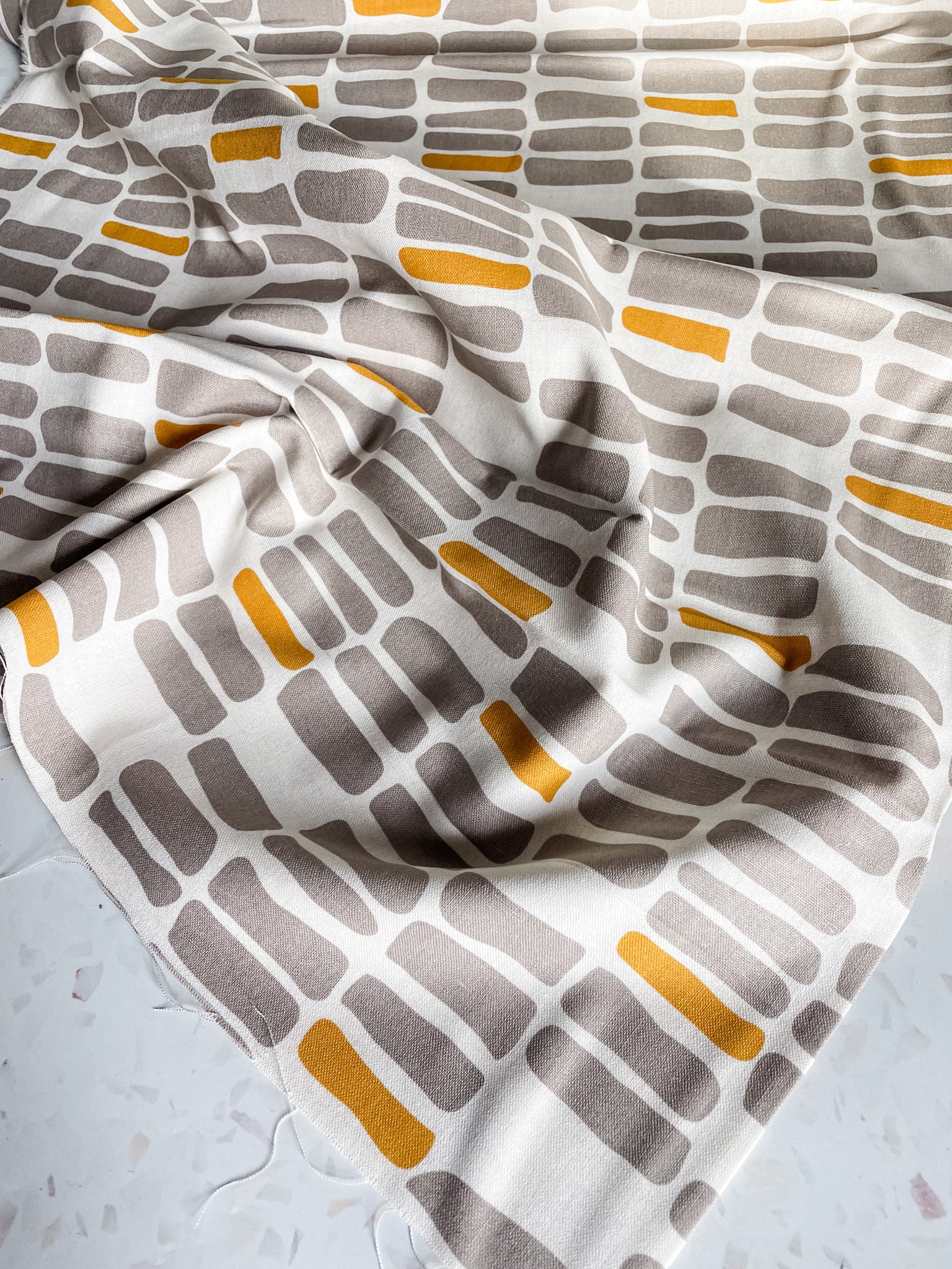 From Zen Chic’s Urban Whisper collection for Moda, this Mochi Linen features irregular brick-like strokes in soft taupe with pops of mustard yellow on a creamy white ground. The design is playful yet restrained, making it a versatile modern print that adds warmth and movement without overwhelming.