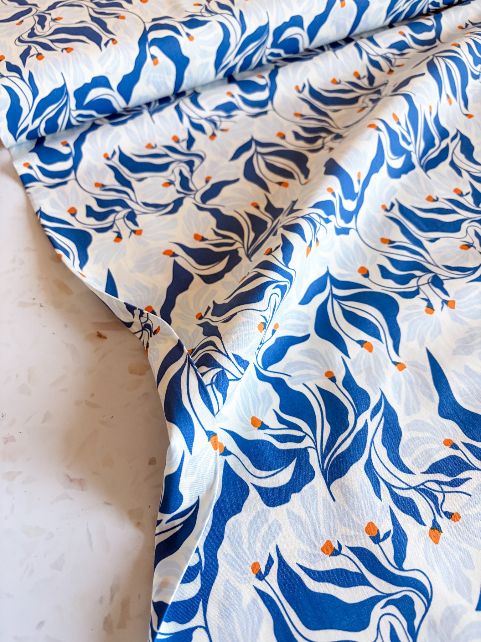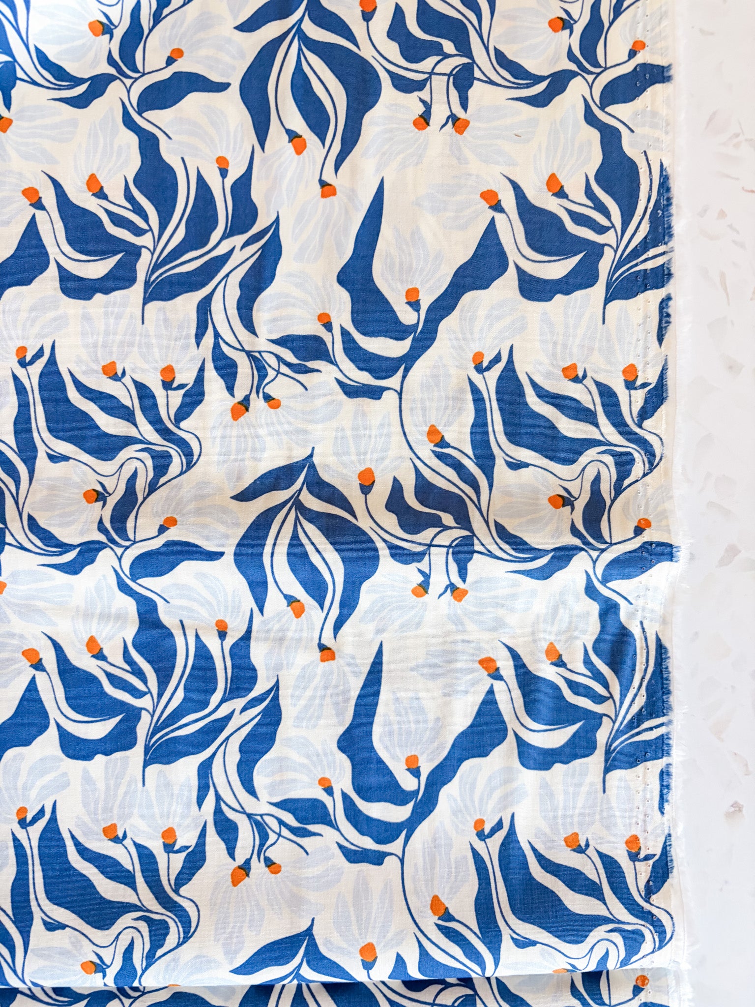 This airy, modern quilting cotton features sweeping blue botanicals accented with tiny pops of orange — a print that feels both artful and effortlessly timeless. Printed on soft, smooth 100% cotton, it’s sturdy enough for quilts and versatile enough for garments, accessories, and home projects.