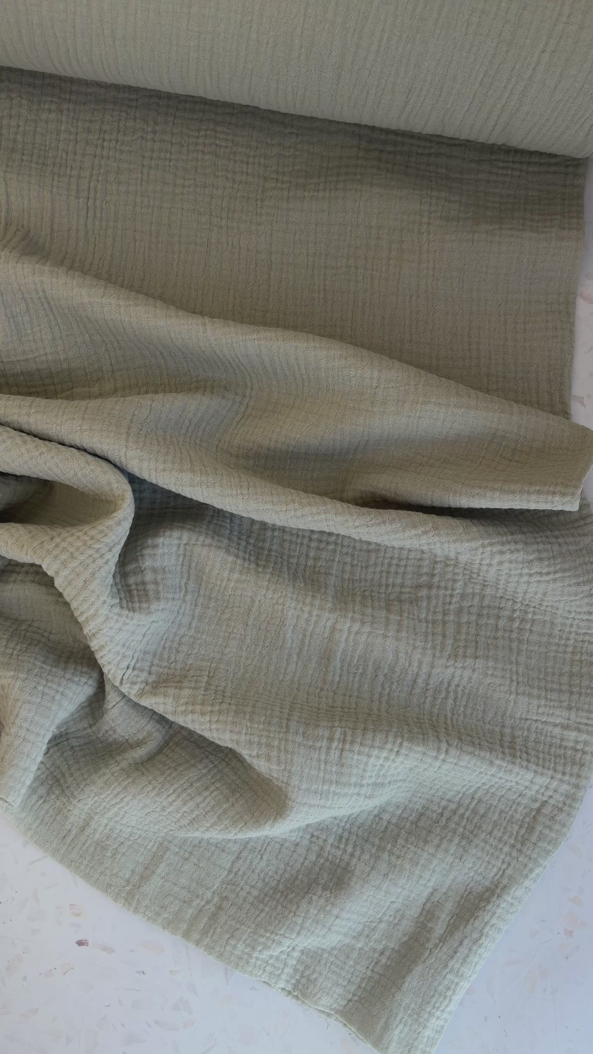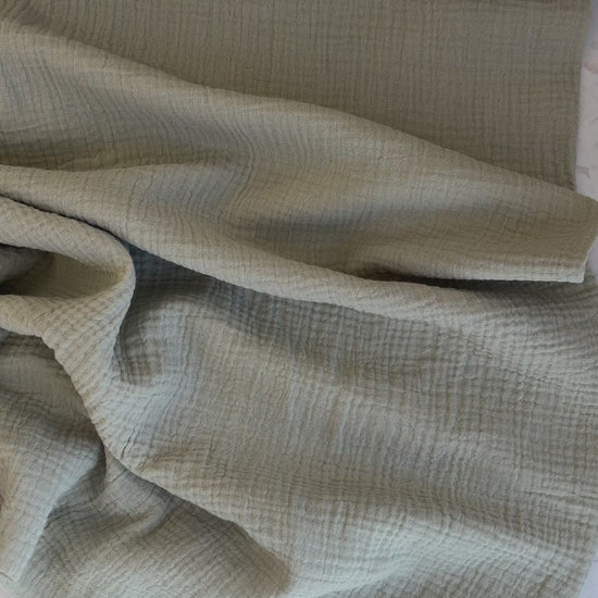 Zola in Celery is a soft, airy organic cotton double gauze in a gentle, muted green that feels as soothing as it looks. Lightly crinkled with natural texture, this fabric has that lived-in softness we love—comfortable from the very first stitch and only getting better with wear and washing.